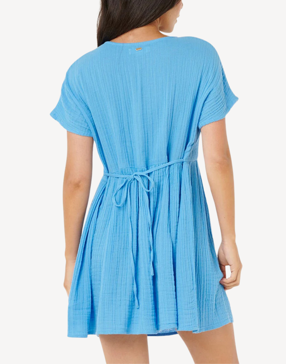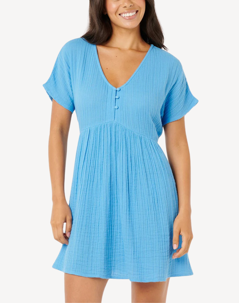 Vibrant hues adorn the Premium Surf Short Sleeve Dress. Perfect for a sunny beach day.