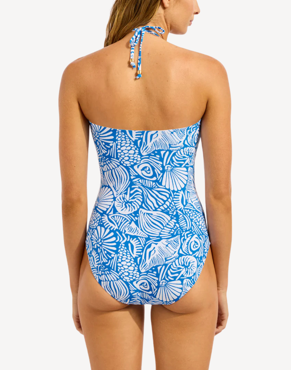 Cruise into beach life in the eye popping C Shells Ring Front Bandeau One Piece Swimsuit featuring a ring front detail and soft tie halter straps.
