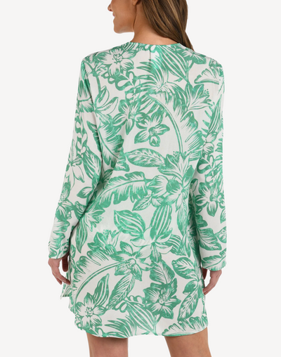 The contrast between the bold greenery and delicate floral details on this print adds a stylish and beach-ready appeal to the tunic. This cover up is made from breezy, lightweight fabric with a lace-up front for throw-on-and-go ease. Long sleeves shield your arms from the sun and add extra warmth post dip.