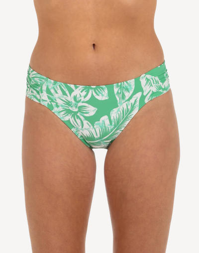 A tropical-inspired design with white floral and foliage patterns set against a vibrant green background, creates a fresh and lively aesthetic. A lace-up detail at the center of the bust allow glimpses of skin to peek through, while allover shirring slims and smooths for a trim look. The double, adjustable straps crisscross in back.