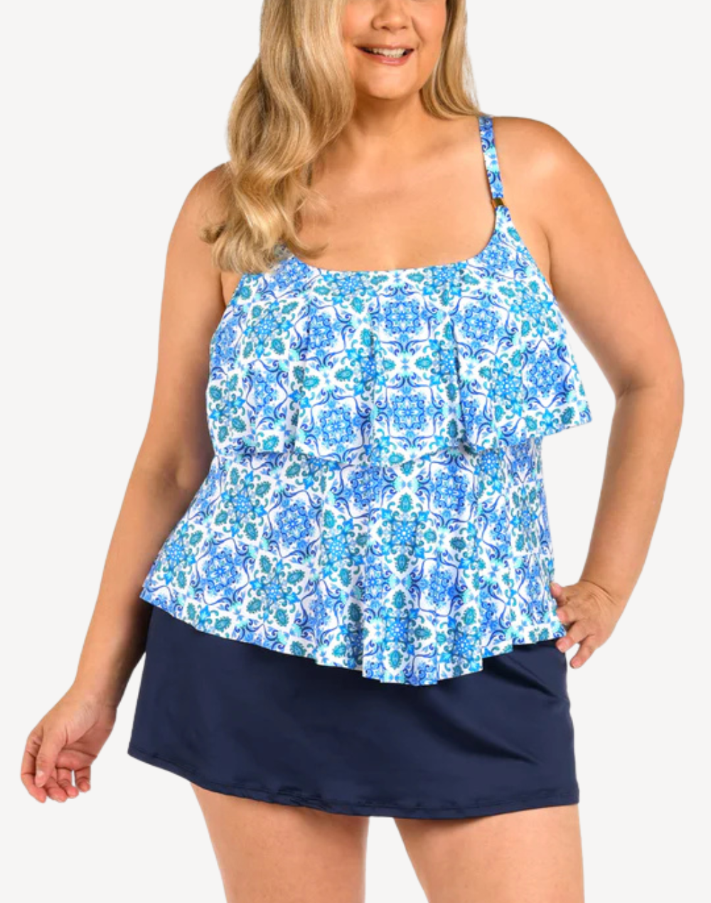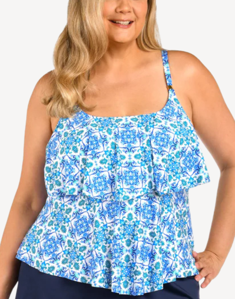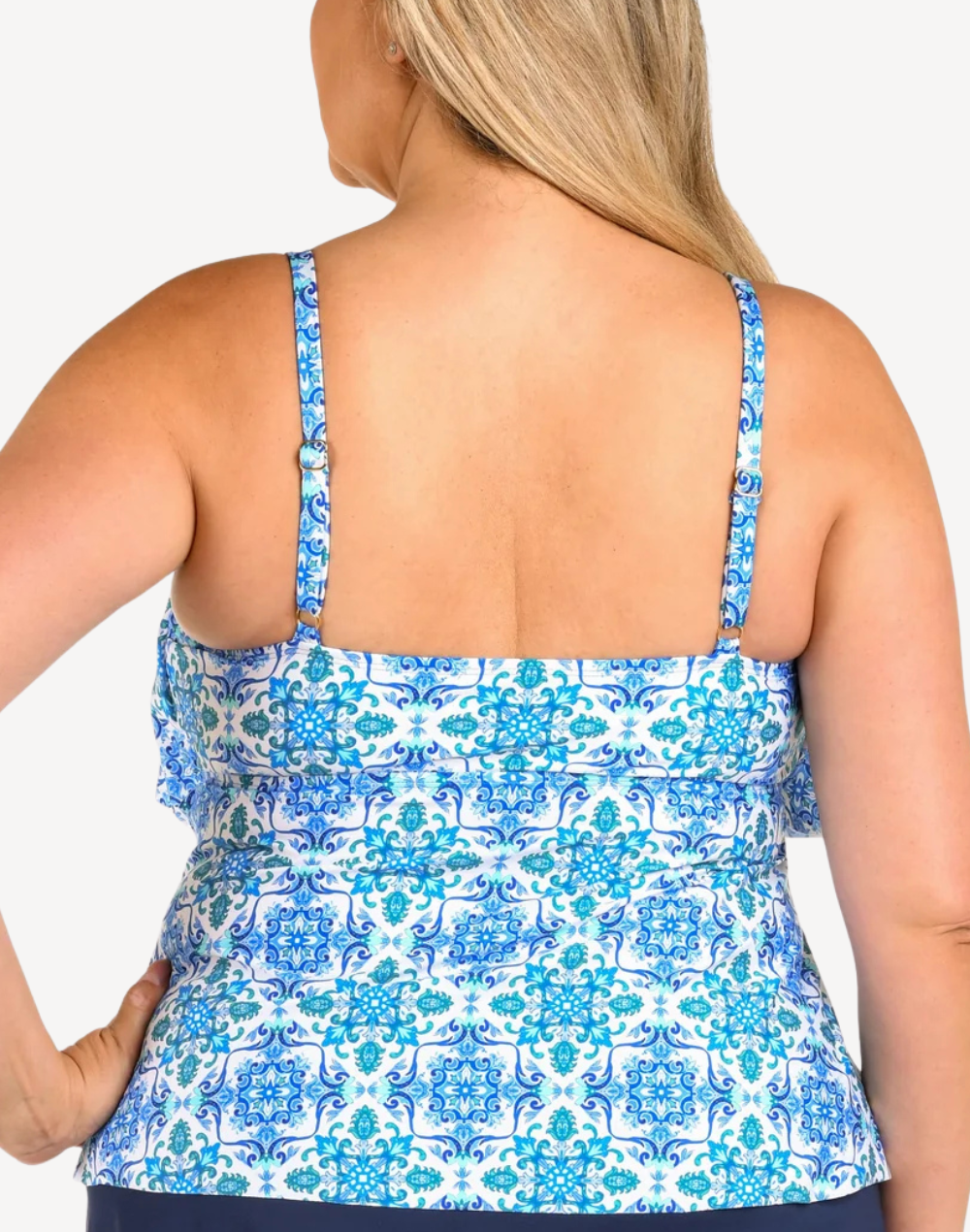 The Beachside Plus Size Tiered Tankini Top features a tile-inspired pattern in shades of blue and white, reminiscent of Mediterranean or Moroccan ceramic designs. With flowing tiered detail and gold slider on the straps, you're sure to be a standout.