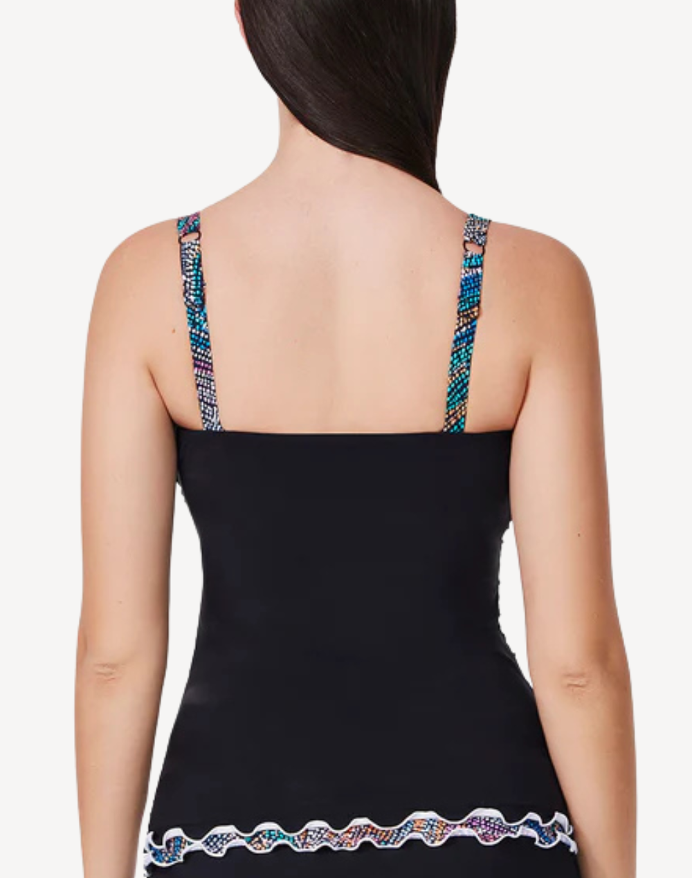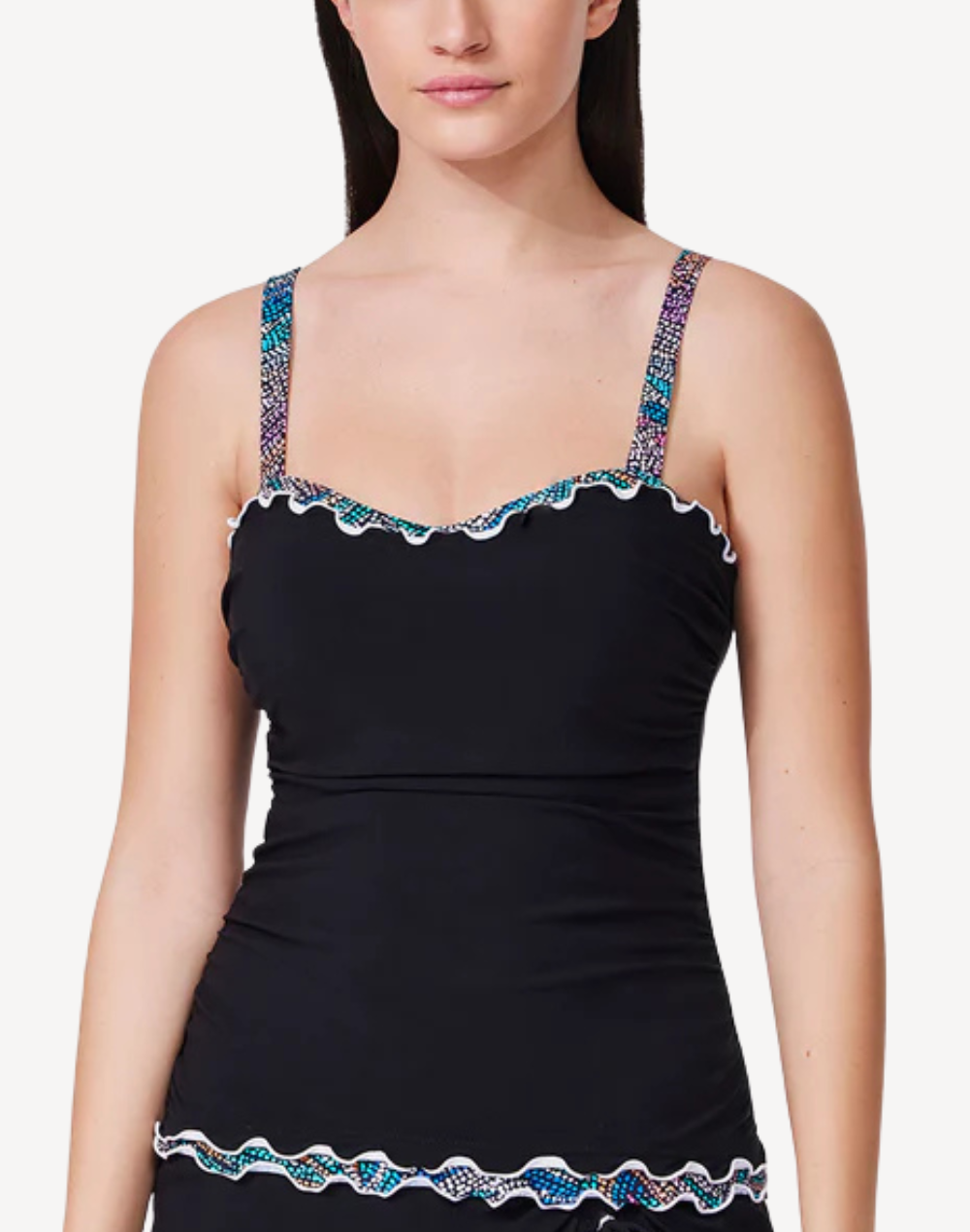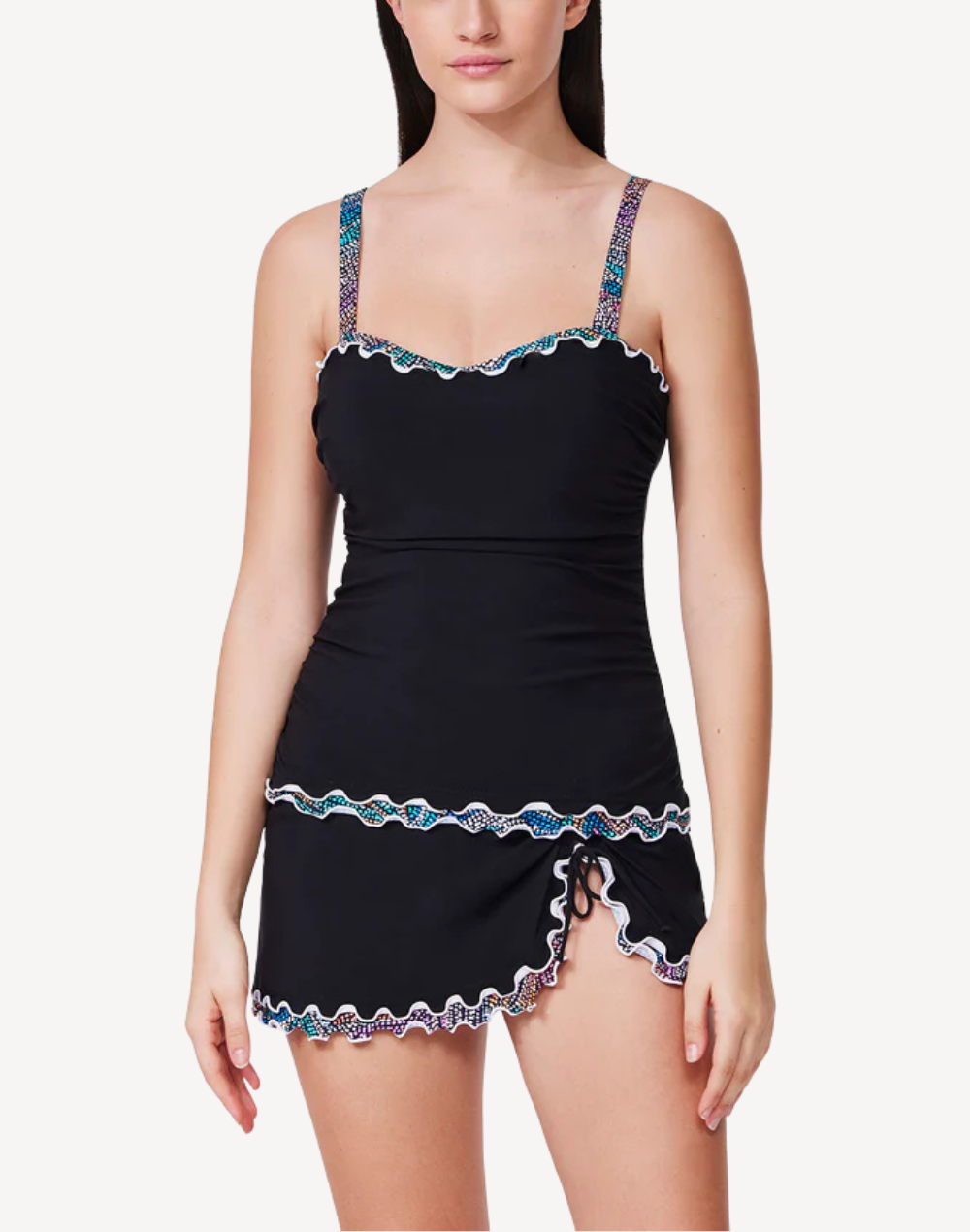 Let your swim style shine with the flirty flair of the Layla Tricolore D Cup Tankini Top. Featuring playful ruffle trim, a supportive underwire D-cup bra, and adjustable straps, it pairs perfectly with the matching Layla Tricolore Side Slit Skirted Bottom.