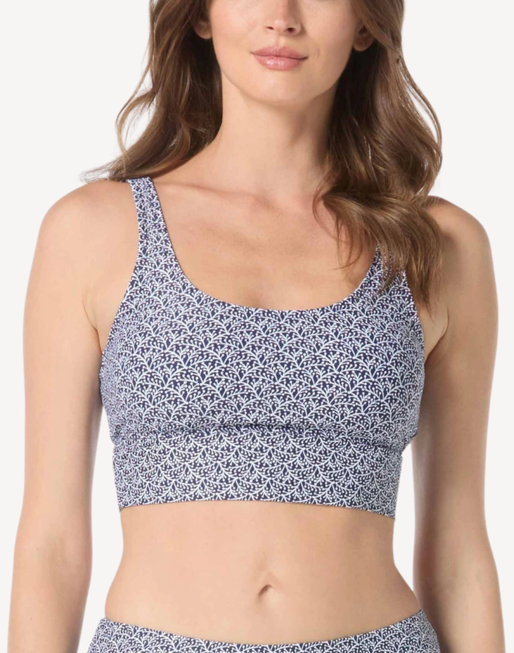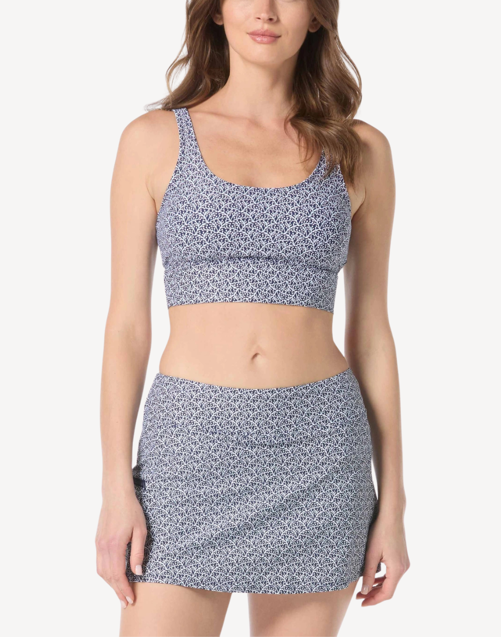 For a sleek and sporty style, the Samoan Floral Empower Crop Bikini Top is perfect as a swim or active option. Adjustable straps provide comfort and support. Pair it with bikini bottoms for the beach or swim skirt and rashguard for pickleball.